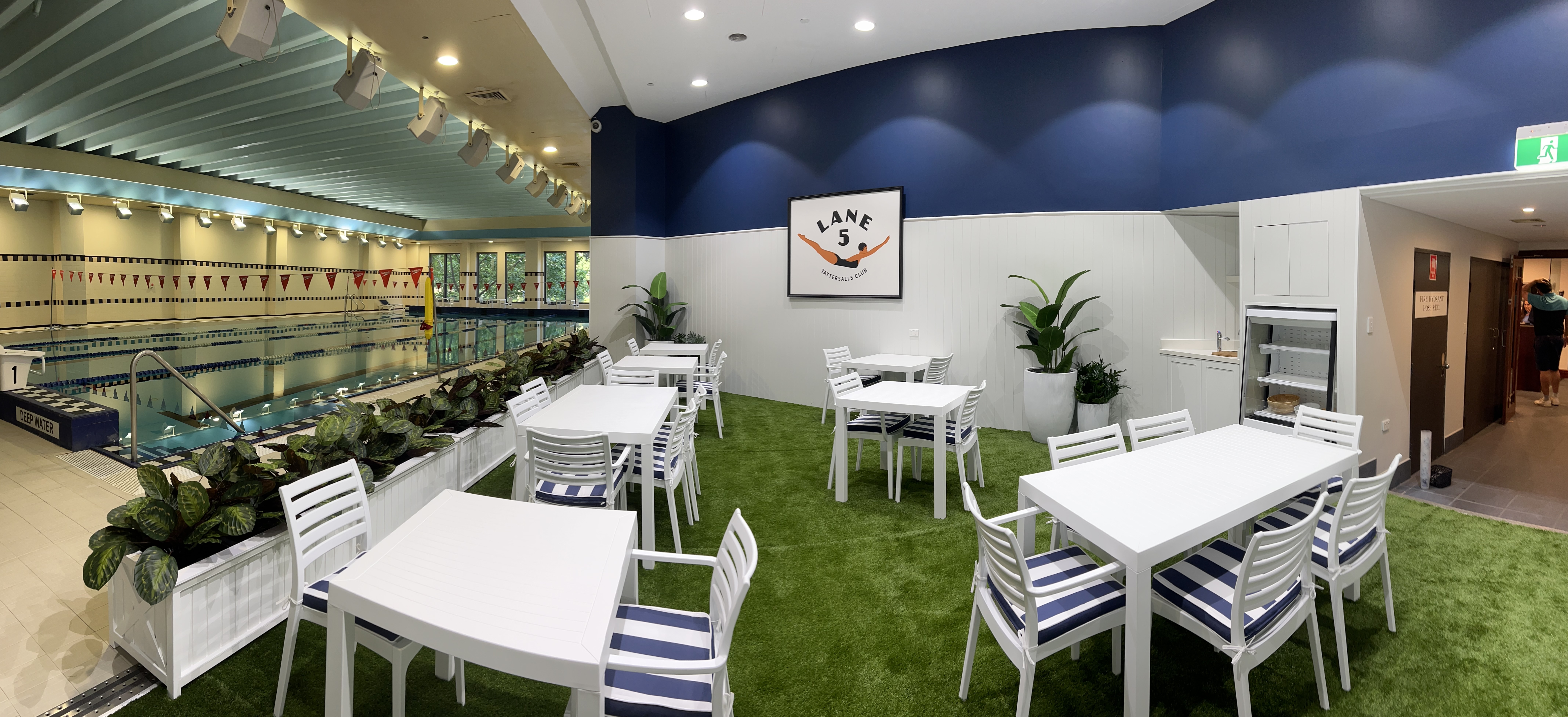 The finishes are materials found in the Hamptons - a casual place to hangout and connect. The design pays homage to the classic navy and white palette to warm up the neutral hues of the overall pool area. Texture is added through synthetic turf, which feels relaxed underfoot and connects guests with nature.