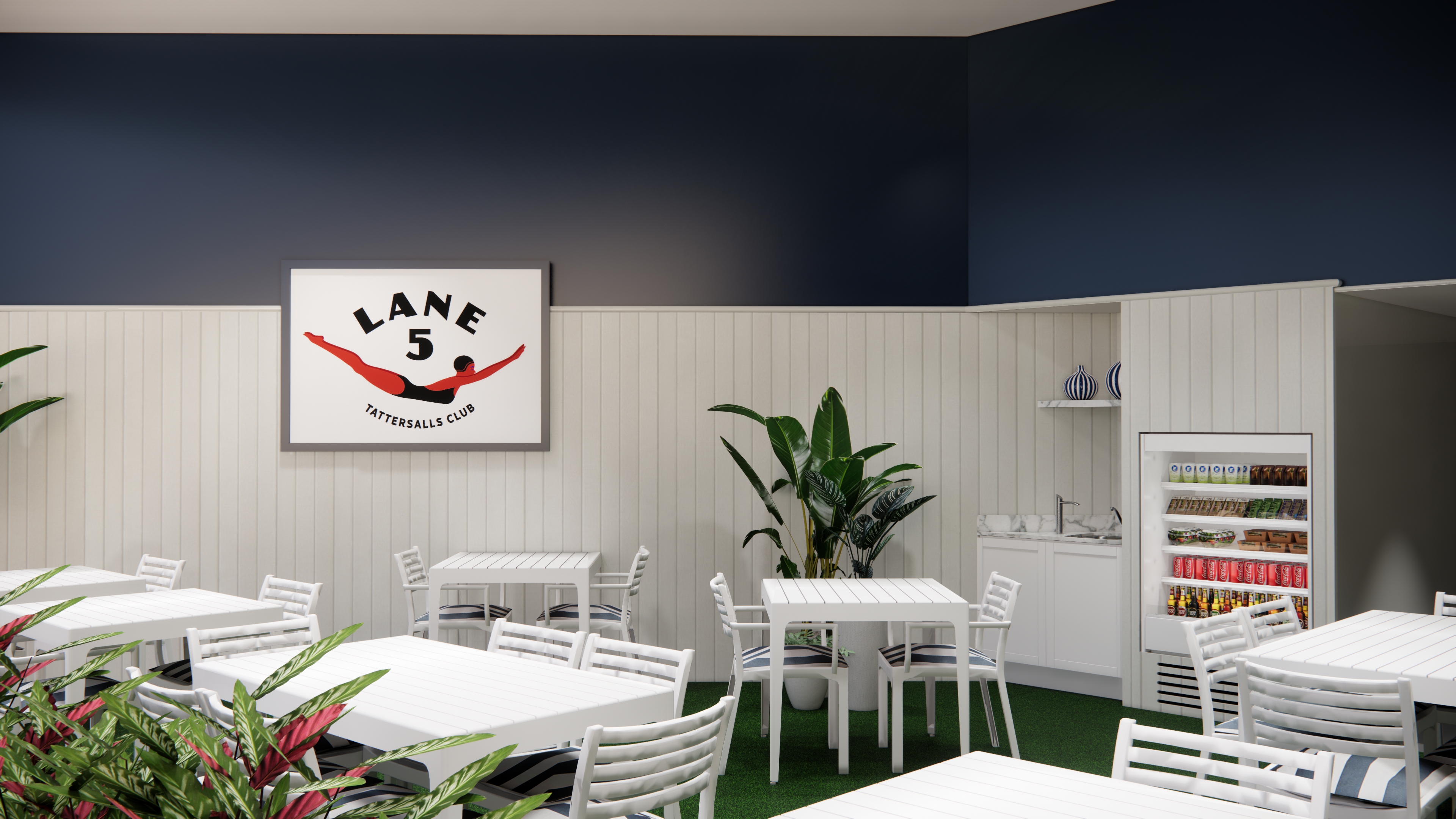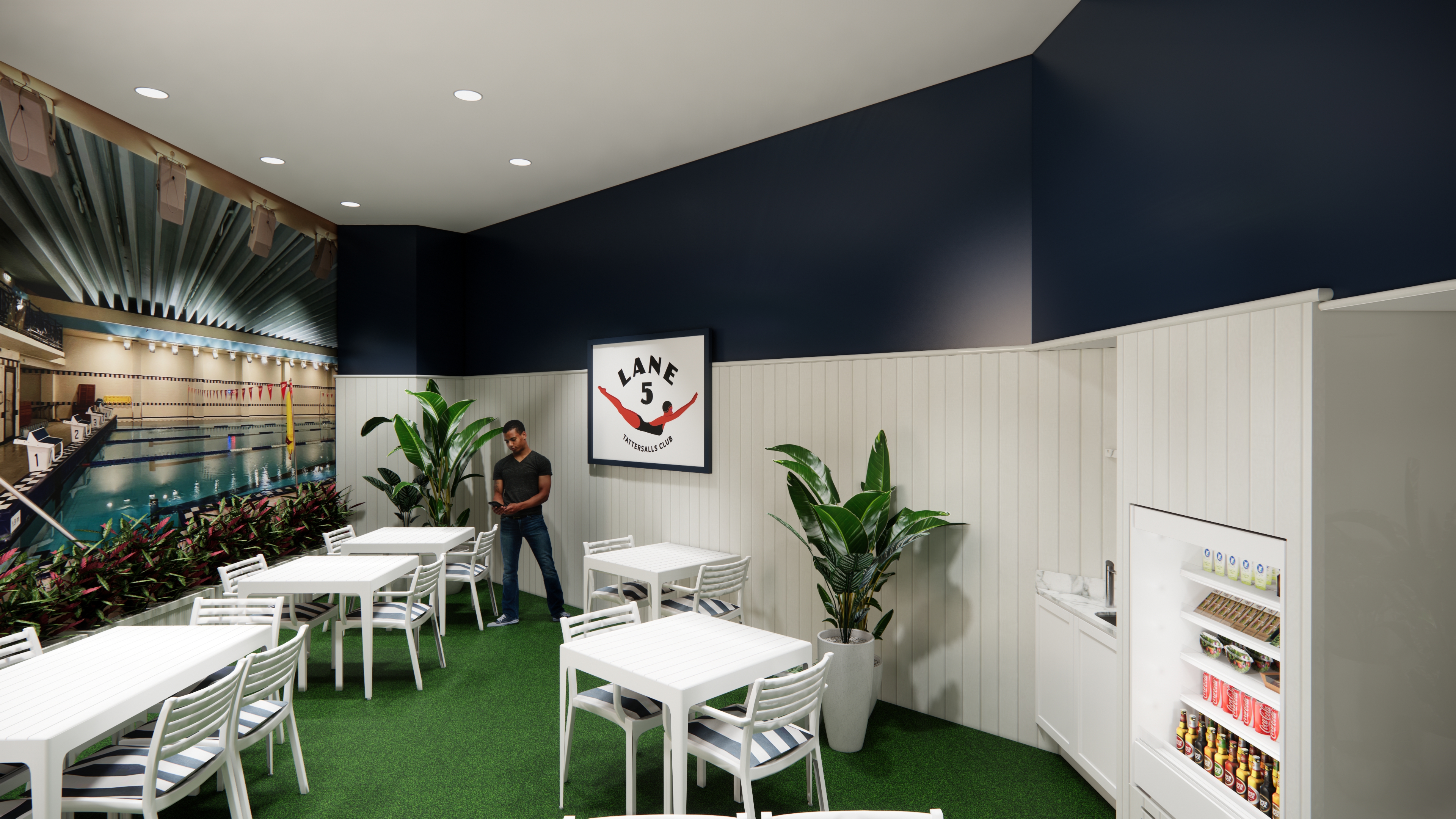 The finishes are materials found in the Hamptons - a casual place to hangout and connect. The design pays homage to the classic navy and white palette to warm up the neutral hues of the overall pool area. Texture is added through synthetic turf, which feels relaxed underfoot and connects guests with nature.